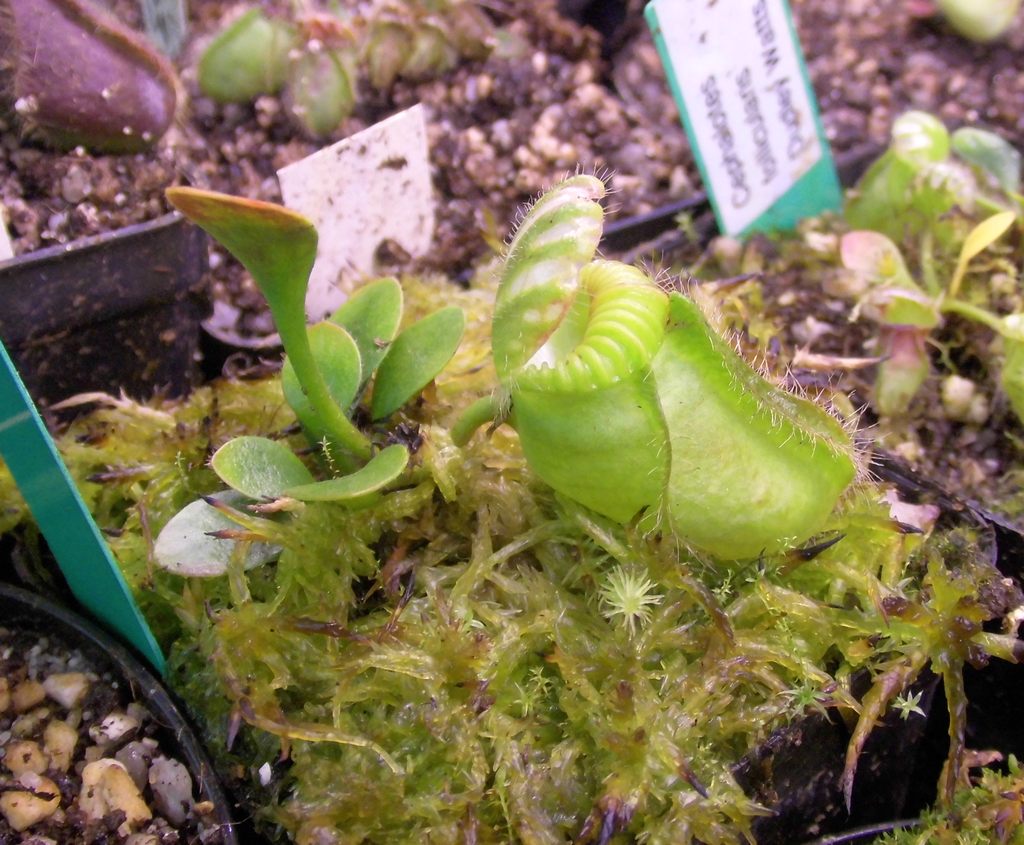 Beschreibung: Die fleischfressende Pflanze Cephalotus follicularis ist die einzige Art in der Gattung Zwergkruggewächse. Zwergkrüge kommen nur in einem begrenzten Areal in Südwesten Australiens vor und wachsen dort unter feuchten Bedingungen. Die arttypischen, eifärmigen Krüge mit Deckel und einem stark gerippten Peristom an Krugrand fungieren als Grubenfallen, mit denen Insekten wie Ameisen gefangen werden. Die Krüge werden ca. 4-5cm groß, bei selektierten Klonen auch deutlich größer, und sind grün, rot oder bräunlich gefärbt. Verschiedene Klone werden bei entsprechenden Bedingungen tiefrot bis fast schwarz. Zusätzlich zu den als Krügen geformten Blättern bildet der Zwergkrug auch normale Laubblätter aus. Die jahreszeitlichen Bedingungen an den Naturstandorten sind ähnlich den unseren, nur dass dort die Winter deutlich milder und meist frostfrei ausfallen.