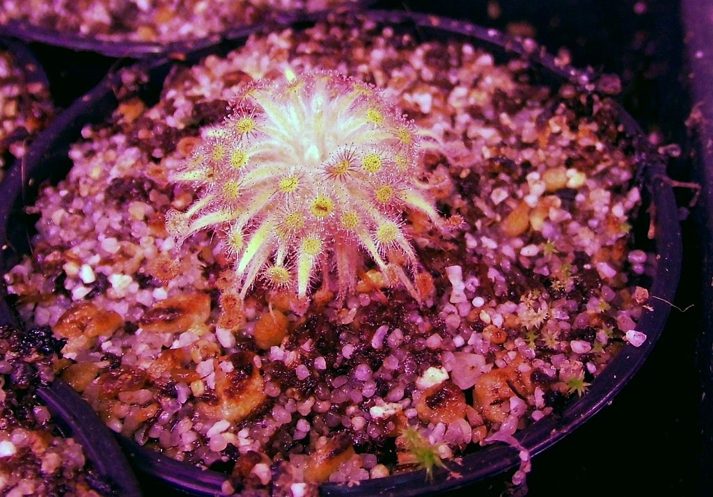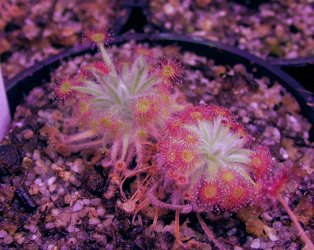 Haltung & Pflege: Damit diese Drosera ihre ganze Schönheit entfaltet sollte die Pflanze möglichst hell stehen. Für die Kultur sind halboffene Glasgefäße oder kleine Terrarium gut geeignet. Diese sollten an einem Südfenster platziert werden. (am sonnigen Fenster keine geschlossenen Glasgfäße verwenden!) Eine Zusatzbeleuchtung über die Wintermonate ist nötig und die Beleuchtungszeit (Tageslänge) sollte ca. 12h betragen. Als "einfache" Art toleriert sie auch eine Kultur bei Zimmertemperatur, wobei sie es wärmer bevorzugt. Als Substrat eignet sich ein sandiges Gemisch auf Weißtorfbasis, welches mit Quarzsand und Perlite aufgelockert wird. Das Kultursubstrat sollte stets feucht gehalten werden. Um das Substrat feucht zu halten kann man den Topf in einen mit kalkfreiem Wasser (Regenwasser oder destilliertes Wasser) gefüllten Untersetzer stellen. Die Pflanze kann ganzjährig feucht kultiviert werden, sollte sie sich aber in eine Ruhephase begeben (deutet sich durch deutlich kürzere Blätter an), sollte das Substrat dann nur noch minimal feucht gehalten werden und der Topf erst beim Wiederaustrieb in Anstau gestellt werden. Wer mehrere Arten aus dem wunderschönen Petiolaris-Komplex kultiivieren möchte, ist gut beraten sich ein ordentlich beleuchtetes Terrarium, ggf. sogar mit Heizung, zuzulegen. Die Töpfe dür die Petiolaris-Drosera sollten etwas höher, ca. 8-10cm) sein, damit kann man die Feuchtigkeit im Substrat während der Sommerruhe besser regulieren.